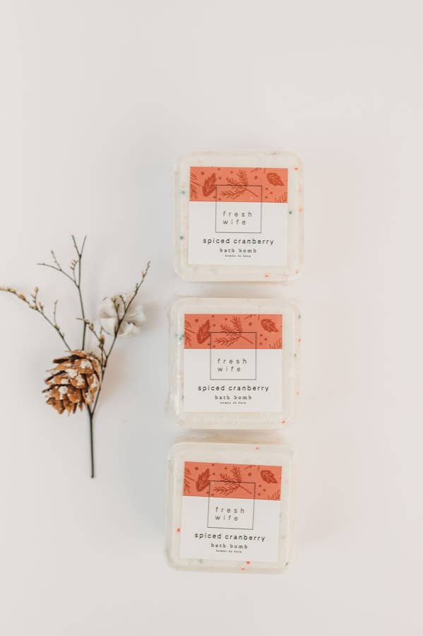 Our bath bombs are full of wonderful skin loving oils so you feel fantastically hydrated and not tight and itchy when you get out of the bath.  We only use essential oils to scent and plant based materials to colour them as our delicate parts deserve only the best!  Safe for all ages..... just remember not to try to wash your or your children's hair in the bath water!  Spiced Cranberry is scented with phthalate fragrance oil that will bring you all the cozy holiday feels while soaking in the tub.   Weight: 125gr Ingredients * Baking Soda * Citric Acid * Corn Starch * Organic Coconut Oil * Cocoa Butter * Grapeseed Oil * Water * Alcohol * Phthalate free fragrance oil * Pink Clay * Mica How to Use Drop or hold in bath water.  Watch as the fizzing action comes to life.... the nourishing oils disperse in the water and the wonderful aromas fill the bathroom.