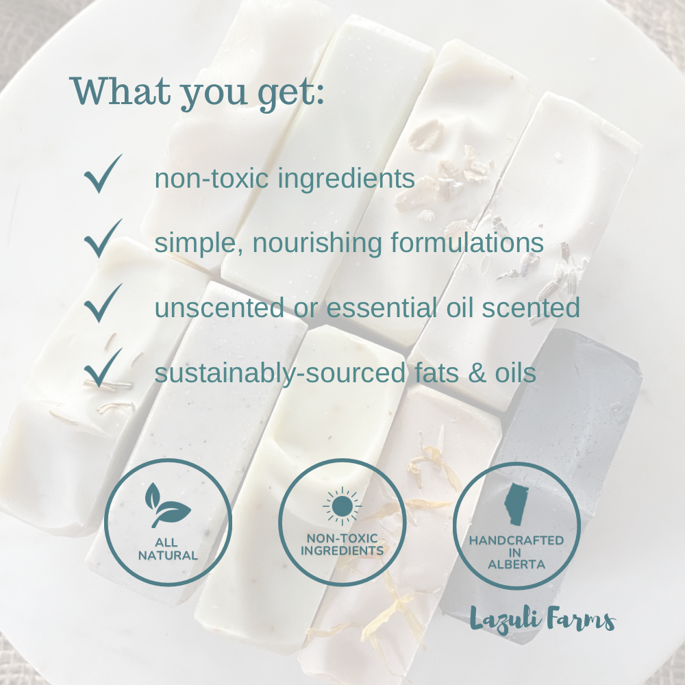 These lemon scented dish soap bars are made with two simple fats that are superbly cleansing while not stripping the natural oils from your dish-pan hands. They are made saponified lard & coconut oil only with a light lemon-y scent from essential oil.